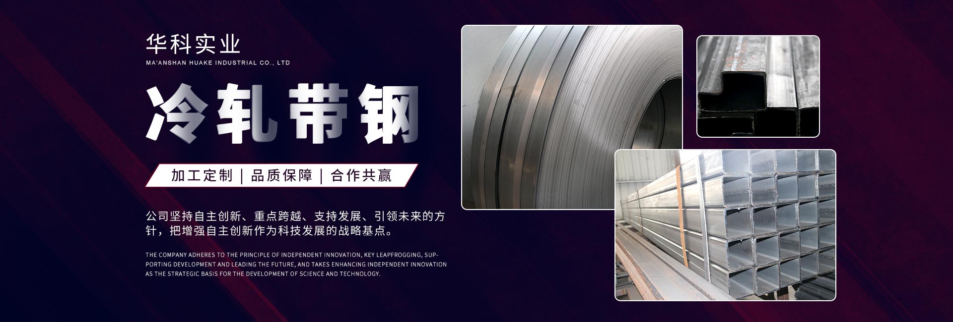 馬鞍山市華科實(shí)業(yè)有限公司是馬鞍山市重點(diǎn)骨干企業(yè)和“專(zhuān)精特新”企業(yè)及安徽省民營(yíng)科技企業(yè)和高新技術(shù)企業(yè),位于“國(guó)家衛(wèi)生城市”和“國(guó)家園林城市”的馬鞍山市雨山工業(yè)園,緊鄰經(jīng)濟(jì)發(fā)達(dá)的長(zhǎng)江三角洲,交通快捷便利。公司原名馬鞍山市華科冶金設(shè)備制造有限公司,始建于1995年4月,是生產(chǎn)冷軋帶鋼的專(zhuān)業(yè)廠(chǎng)家。憑借馬鋼得天獨(dú)厚的原材料資源和安徽工業(yè)大學(xué)雄厚的技術(shù)優(yōu)勢(shì),歷經(jīng)十多年艱辛的磨礪,華科公司已在新材料研發(fā)及成型技術(shù)領(lǐng)域獨(dú)樹(shù)一幟,成績(jī)裴然。公司下轄冷軋帶鋼分公司(帶鋼車(chē)間、焊管車(chē)間、不銹鋼復(fù)合管和卷簧車(chē)間);連鑄(端板)分公司,并與安徽工業(yè)大學(xué)合作創(chuàng)辦了材料成型技術(shù)研究所。公司總資產(chǎn)7000多萬(wàn)元,2010年、2011年技工貿(mào)收入連續(xù)超過(guò)億元,銀行信用AAA等級(jí),為馬鞍山市“民營(yíng)企業(yè)”、“誠(chéng)信企業(yè)”、“專(zhuān)精特新”企業(yè)、“民營(yíng)100強(qiáng)企業(yè)”、“民營(yíng)企業(yè)百?gòu)?qiáng)排序10強(qiáng)企業(yè)”、“重點(diǎn)骨干企業(yè)”和安徽省A1級(jí)誠(chéng)信納稅客戶(hù)、民營(yíng)科技企業(yè)及高新技... [查看更多]